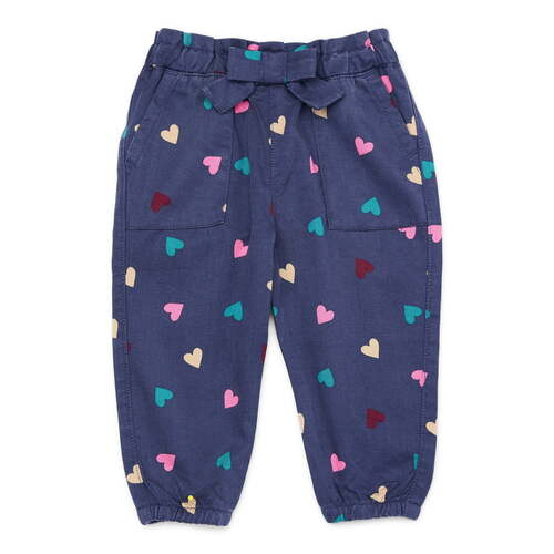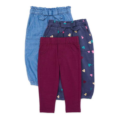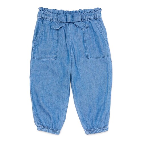 - Denim Pants features: Relaxed fit; pull-on styling ; elastic paperbag waistband with decorative bow; two front chop pockets; elasticized cuffs; includes one solid and one print pair
