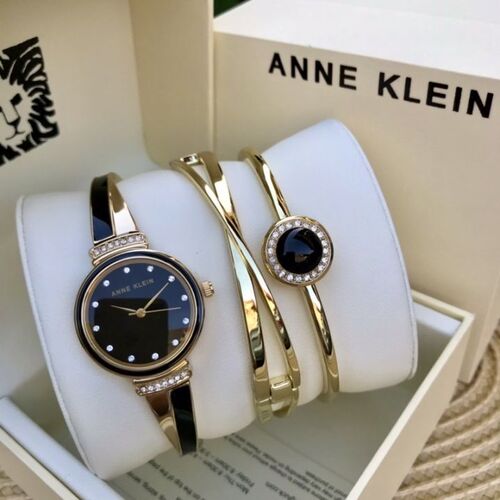 Anne Klein Women’s Crystal Accented Watch and Bracelet Set – Black and Gold