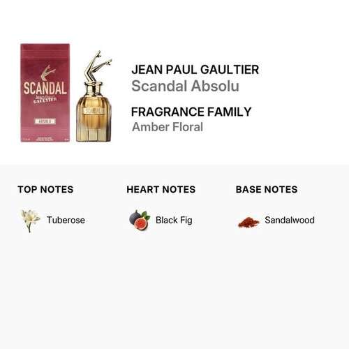 Scandal Absolu opens with the enchanting top notes of Tuberose, creating an irresistible allure from the very first spritz. As the fragrance unfolds, the heart notes of Black Fig take center stage, adding a rich and captivating depth to the scent. Finally, the base notes of Sandalwood ground the fragrance with a warm and sensual finish, making it perfect for any occasion.
